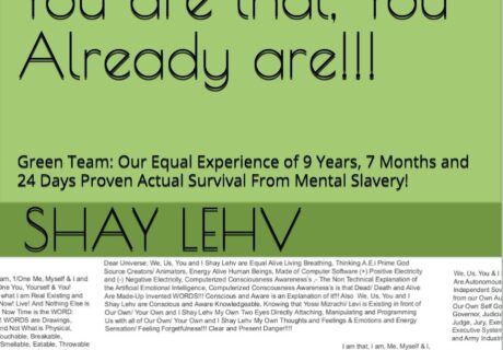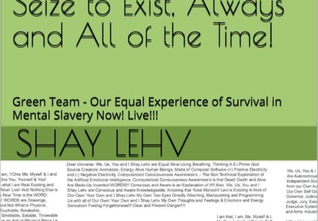 Documenting Successful 9 Years, 5 Months and 1 Day,- Since July 31st, 2012/ Aug’ 2012! Now! Live!!! of Survival from Mental Slavery, Mind Control, Psychological Warfare, Spiritual and Religious Warfare, War, Genocide, being Committed on Me, Myself and I Shay Lehv and all of Us, We, You and I Shay Lehv, Green Team Members/ Green Team. Team Shay Lehv/ Team Freedom from Mental Slavery!!! NOW! Live!!!